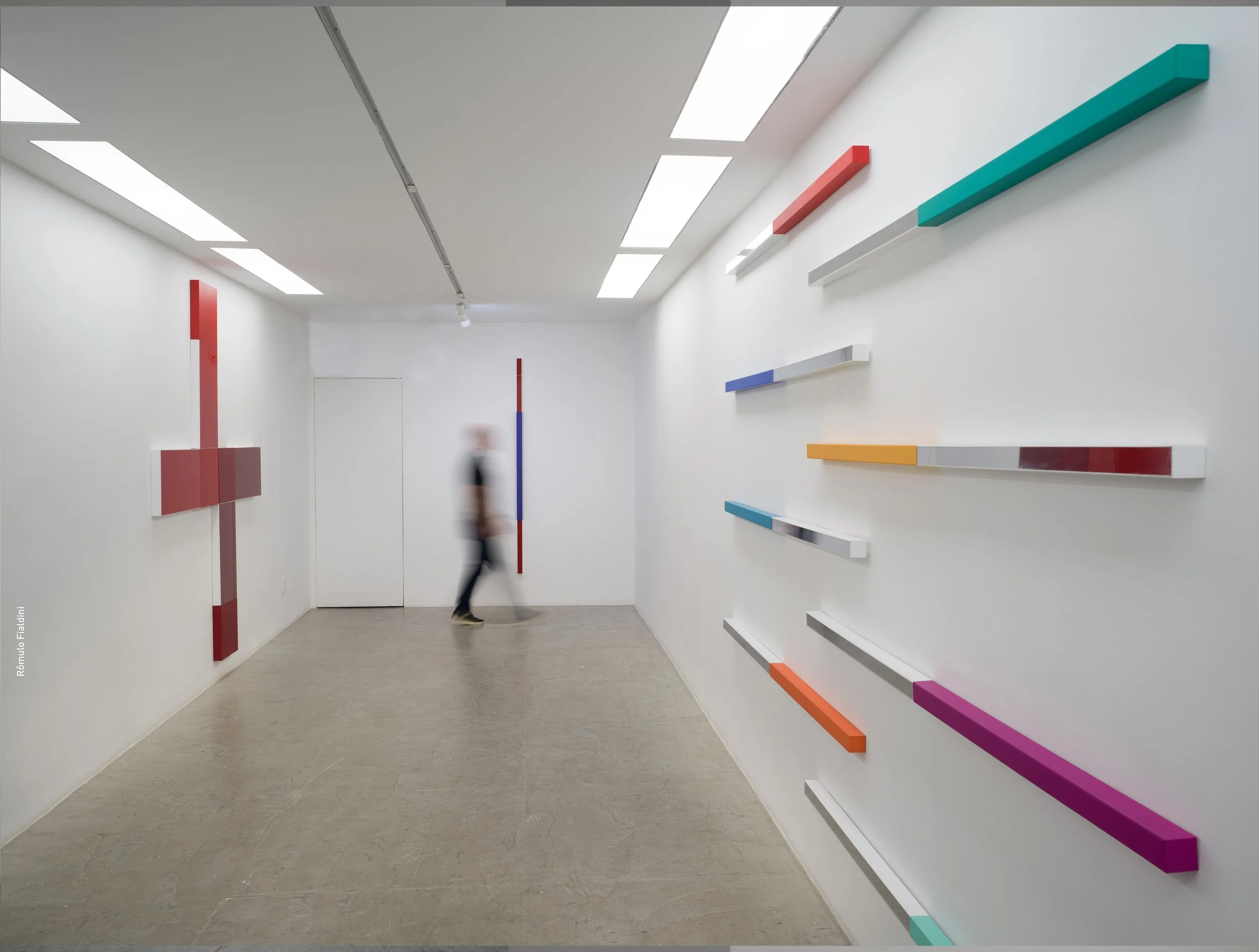 O formato é a cor, e a cor dá o formato. Conteúdo e continente, uma coisa só. Uma pintura que não é “pintada”, é construída, ao modo como as coisas são hoje. Vejo aí uma acercamento da realidade em volta. Um pop que não é de imagens, mas um processo similar ao pop atravessa aqui as cores; ou seja, a disponibilidade da monocromia pura, distinta, inequívoca, dá corpo à pintura. A cor é “objetivada” como “imagem”. É ela agora que se “instala” nos formatos mais diversos. Ao experimentar um formato longilíneo e alongado, sugere a aproximação a um limite; o quadro se torna uma “fresta”, um espaço mínimo, divergindo da aparição tradicional da pintura. Por outro lado, o acrílico espelhado reforça seu caráter material. Ainda assim, o quadro é cada vez mais uma estrutura formada por elementos simples: um objeto construído. Por meio de um processo de adição - soma de partes –, resulta o alocamento de cada seção de matéria cor; presenças luminosas tal como escalas, progressões, andamentos. Enfim, uma só, construções planares e cromáticas.